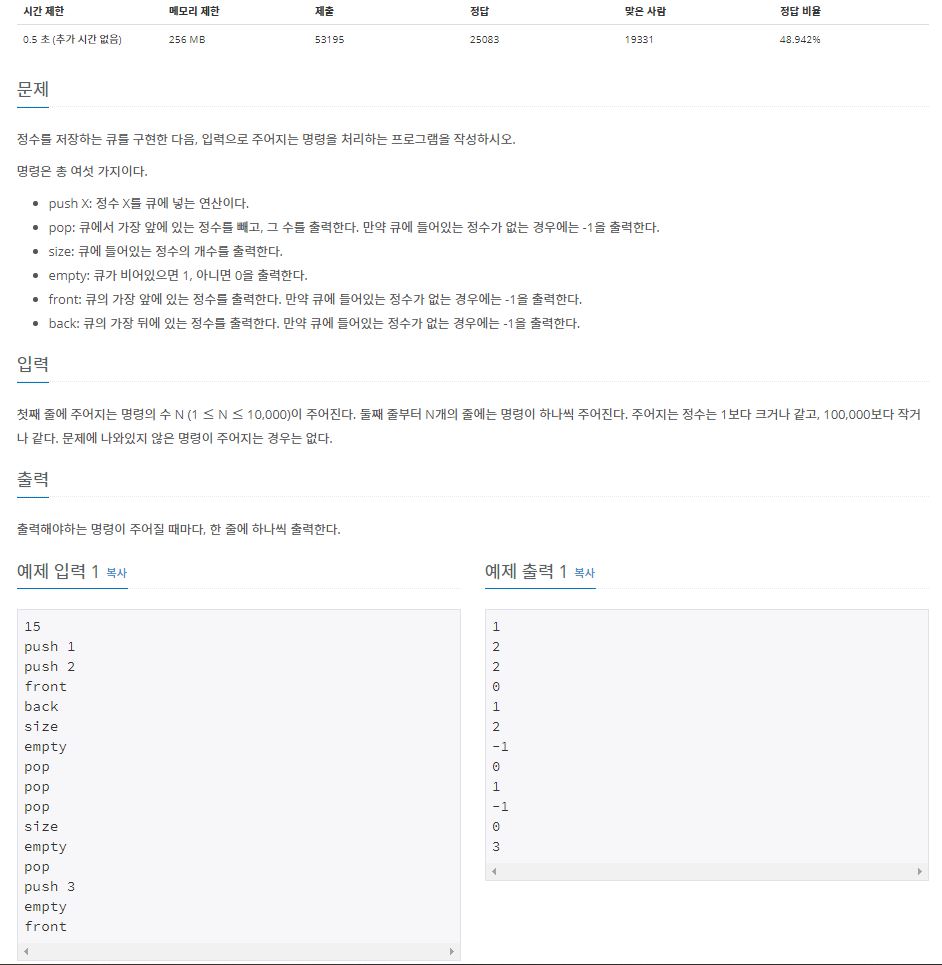 - back의 경우 queue에서는 딱히 구현하고 있는 메소드가 없다 어차피 꺼낼 값이 없으면 -1을 출력하기에 마지막으로 push 받은 num을 전역변수로 설정해서 가져다 출력하는 방법을 사용하였다.
