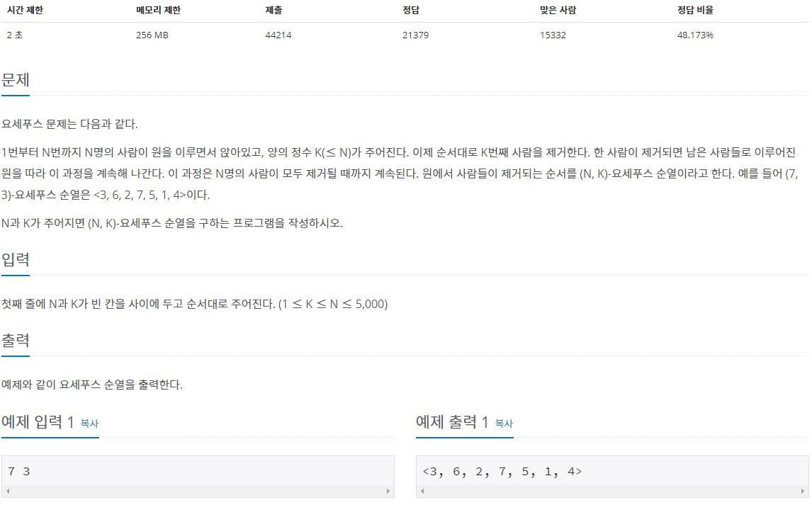 - 1부터 n까지의 숫자를 큐에 담은 후 k번째 전까지는 꺼내서 다시 담고 k번째는 꺼내서 출력하면 된다