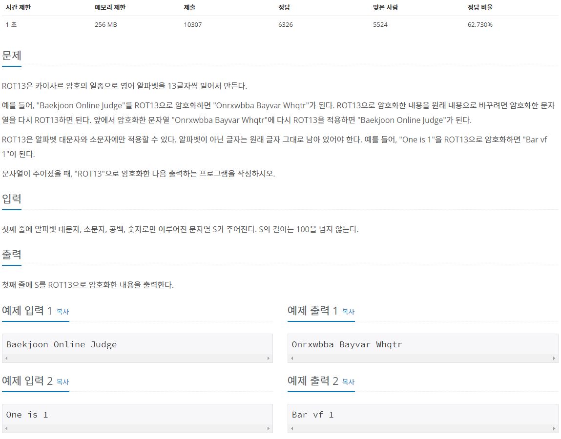 - char 형은 아스키코드로 되어있기 때문에 간단하게 += 13을 해주면 된다