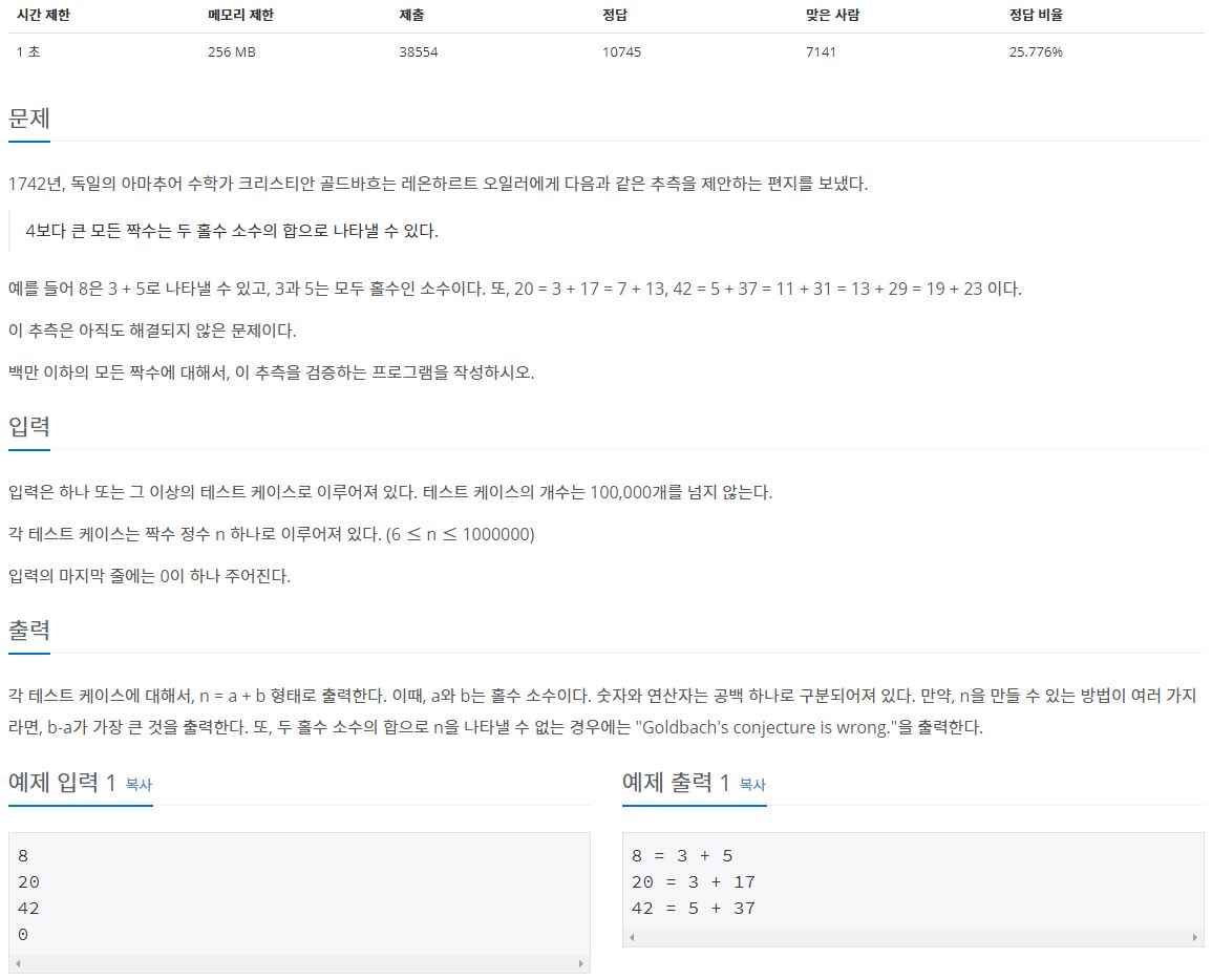 - 추측이 성립 안될 경우 "Goldbach's conjecture is wrong."를 출력해야 하지만 그런 경우는 없는 듯 하다(flag 변수로 해주는 것이 좋다)