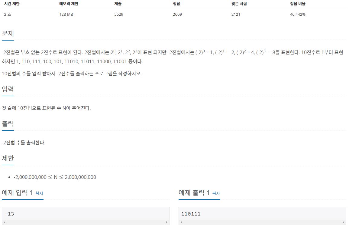 - 2진수를 구하는 것과 똑같이 구하되 나머지 연산은 -2로 하고 나누기 연산은 ceil을 통해 올림 연산을 한다