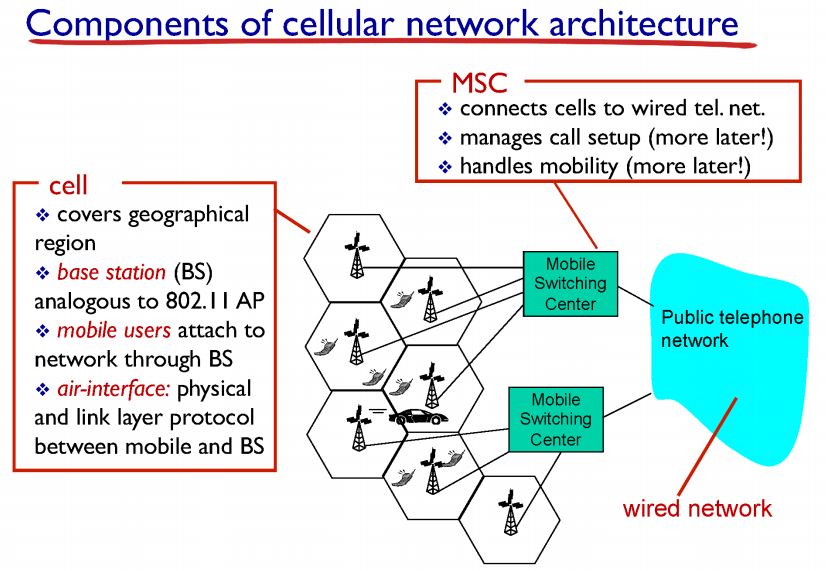 - 전체 담당하는 지역을 셀로 나눠서 셀 하나에 기지국 하나 심어놓고 그 셀에 속하는 host들을 담당해서 cellular network 라고 불림