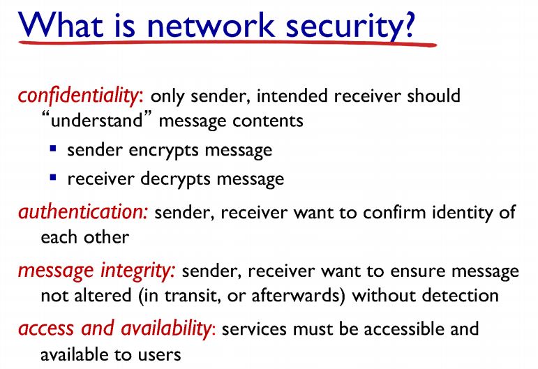 1. confidentiality: 기밀성, 센더와 리시버의 통신 내용을 제 3자가 알아서는 안된다