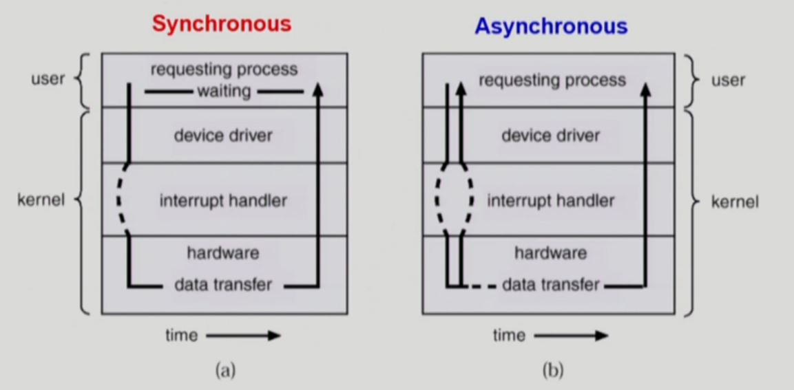 - 두 경우 모두 I/O의 완료는 인터럽트로 알려줌