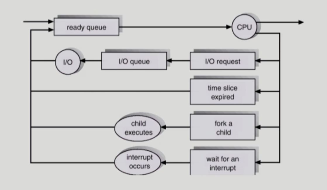 - fork a child: 프로세스가 실행중인 동안 자식 프로세스를 실행시킬 수 있음, 그때도 CPU를 반납하고 ready queue에서 기다림