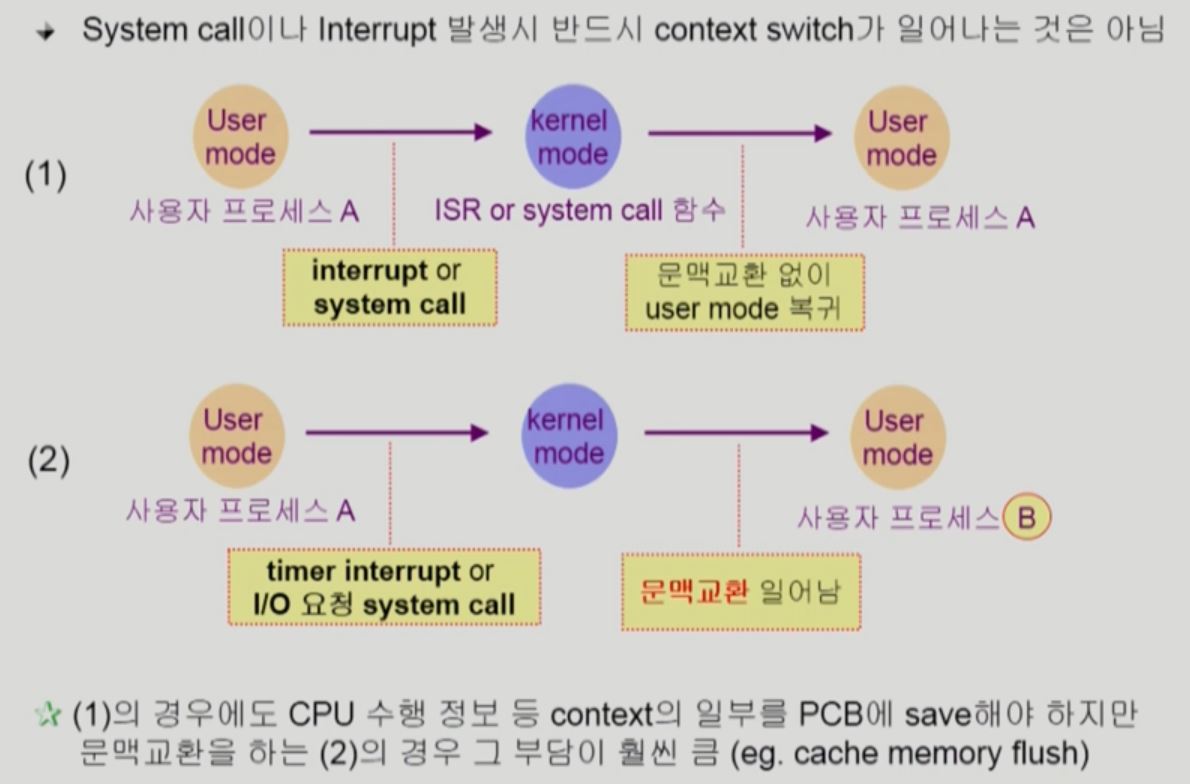 - 시스템 콜이나 인터럽트 발생시 반드시 문맥교환(CPU 넘겨줌)이 일어나는 것은 아님