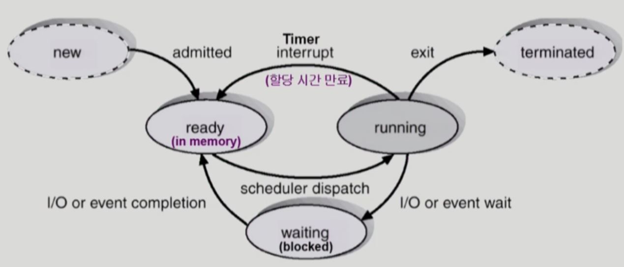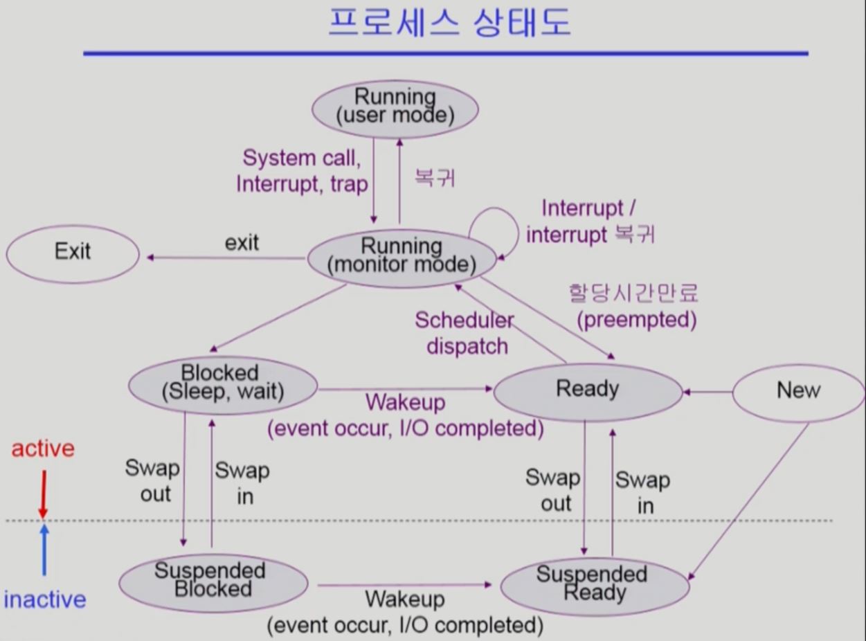 - running(monitor mode): 사용자 프로그램이 시스템 콜등을 통해 커널 함수를 실행하는 경우(이 경우도 사실 OS가 실행중이다 라고 하지 않고 사용자 프로그램이 실행중이다 라고 함)