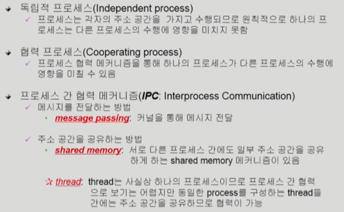 - 협력 프로세스: 가끔은 다른 프로세스에 영향을 미치는게 효율성이 더 좋을때가 있음, 협력 매커니즘을 통해 가능해짐