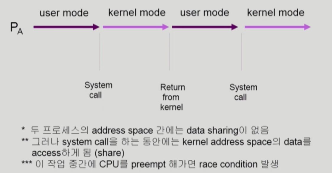 - 두 프로세스가 공유하는 데이터가 있을때, 혹은 커널 함수를 실행중일때 race condition이 발생할 수 있음
