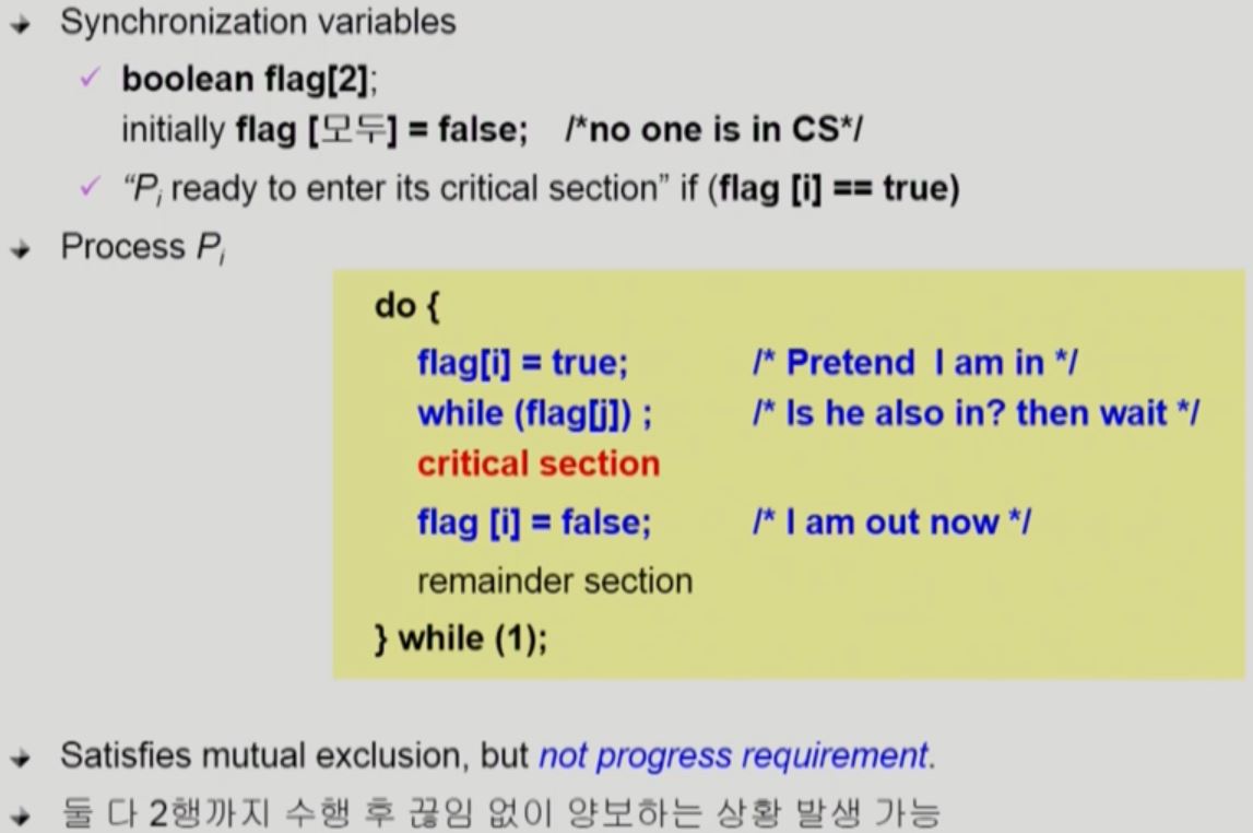 - 이 경우 flag[i] = true 이 상황에서 CPU를 빼껴버리고 j 차례가 오면, j도 flag[j] = true 하고 i를 기다림