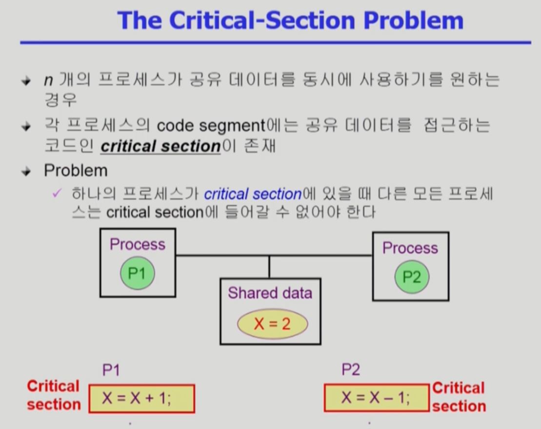 - 공유하는 데이터가 있을때 해당 공유 데이터를 수행하는 연산을 Critical section이라고 함