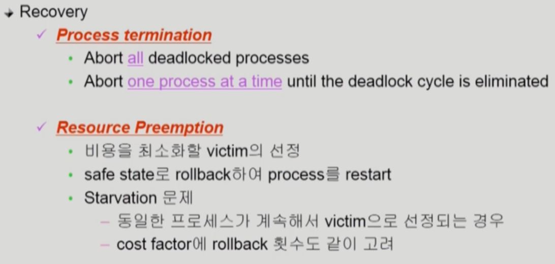 2. resource preemption: 비용을 최소화할 프로세스부터 하나씩 kill(safe state로 롤백)해서 원인을 찾음, starcation 현상이 발생할수 있으므로 롤백횟수도 같이 고려