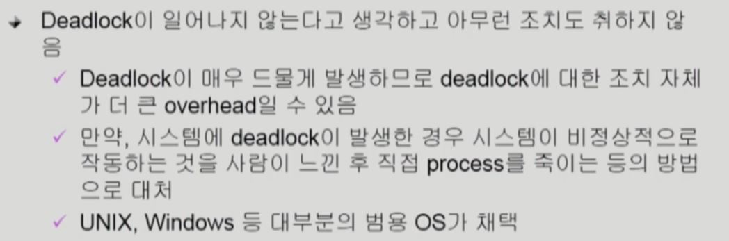 - 데드락은 빈번히 발생하는 이벤트가 아니기 때문에 이걸 미연에 방지하기 위해서 비효율적인 방법을 쓰느니 자원 요청하면 있는만큼 주다가, 데드락이 발생해서 느려지게되면, 그때 데드락을 찾아내서 recovery 시킴