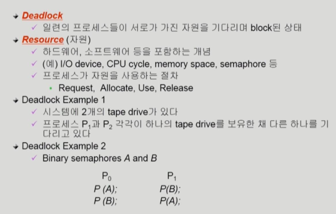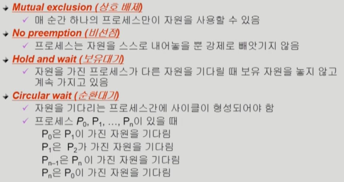 - 하드웨어던 소프트웨어던 공유자원을 서로 보유한 채 서로껄 요구하면 데드락이 걸림