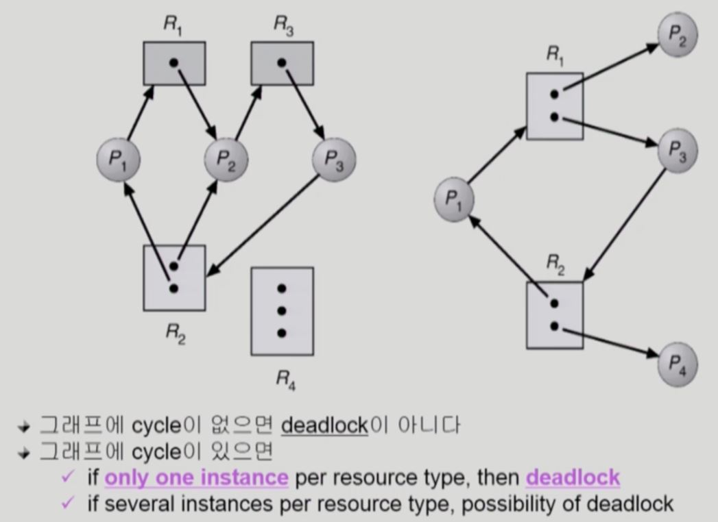 - 오른쪽은 싸이클이 있지만 자원이 여러개므로 데드락이 안생길수도 있음