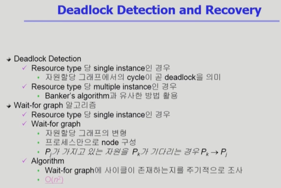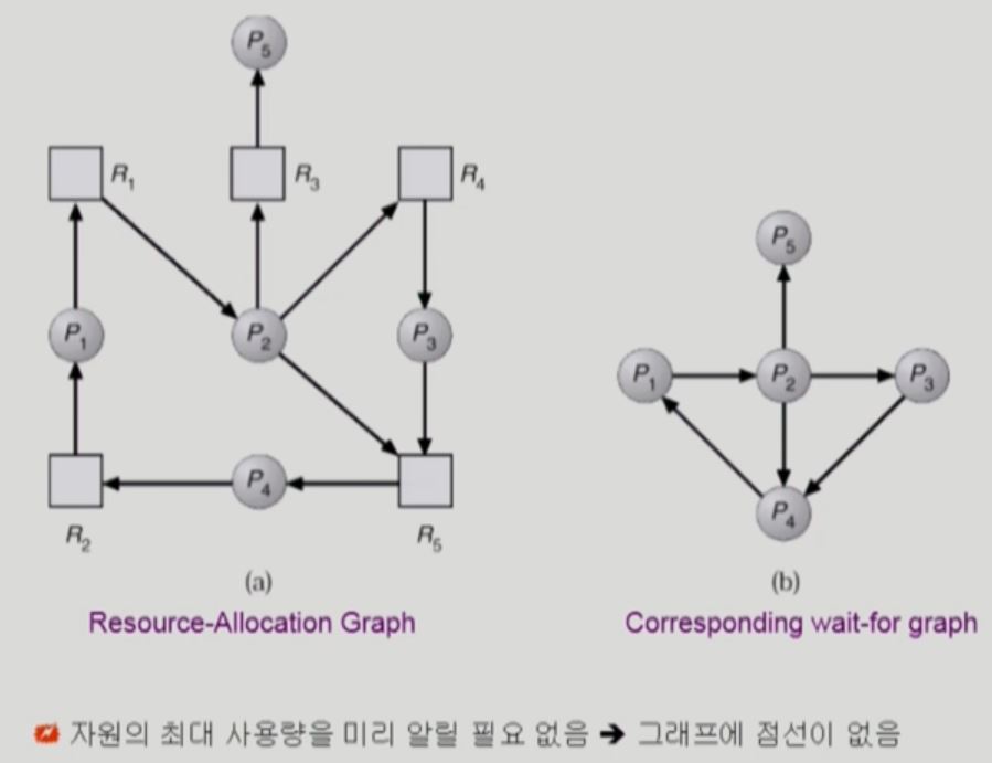 - 똑같이 사이클을 찾음, 하지만 자원인 네모를 빼고 프로세스만 존재하는 wait-for 그래프로 더 간단하게 찾을 수 있음