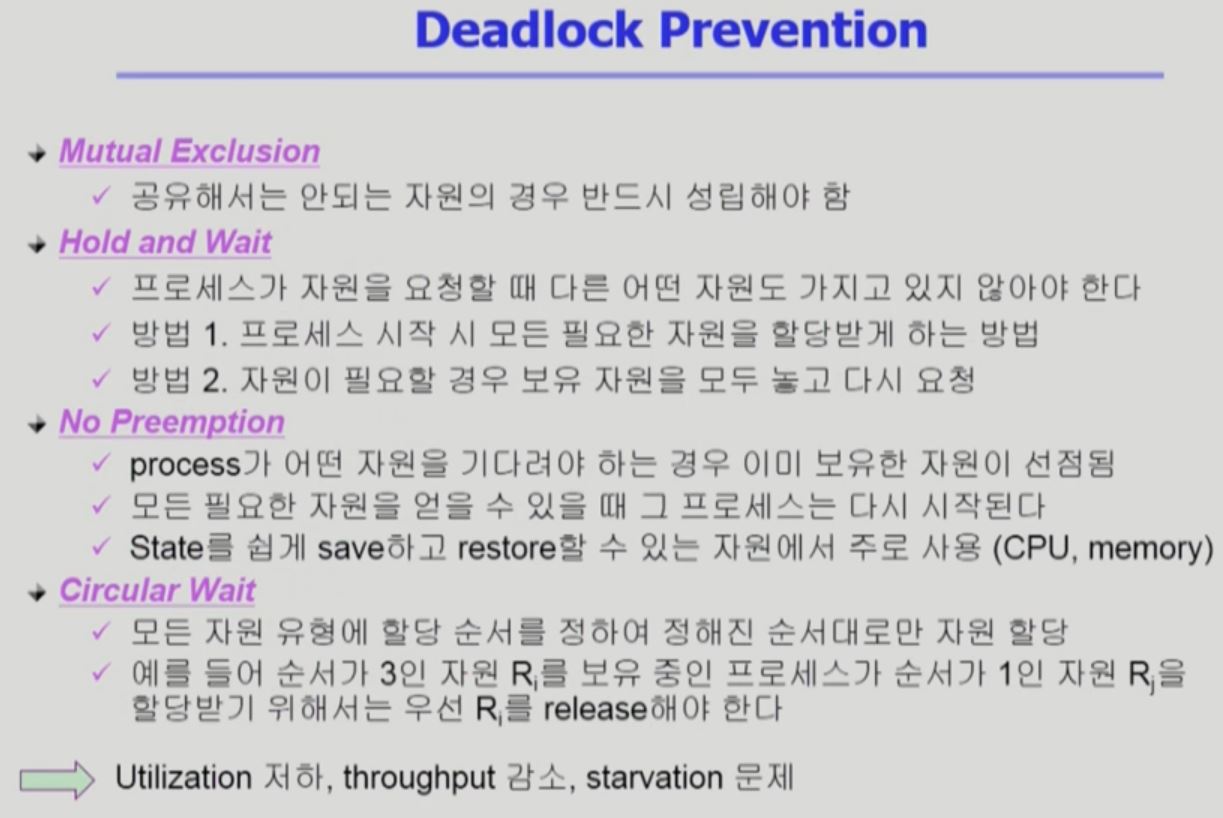 3. no preemption: 자원을 빼앗을수 있게함, CPU와 메모리의 경우 중간에 preemption을 당해도 그 시점을 정확하게 기억하고 있으므로 다시 시작하는데 문제가 없음, 하지만 중간에 preemption을 당하면 공유 자원에 문제가 생기는 경우 이 방법은 사용할 수 없음