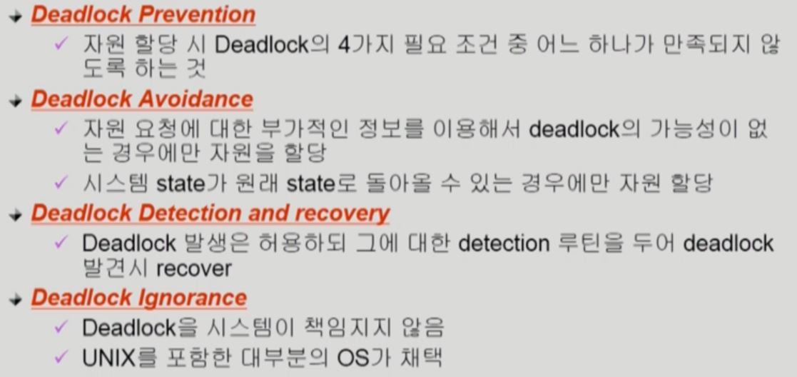 - 현 OS 대부분이 4번째를 선택, OS가 데드락을 관리하는게 아닌 사용자가 직접 kill 하는 방식으로 해결
