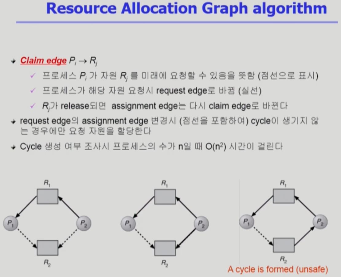 - 맨 오른쪽 사진의 경우, 점선으로라도 사이클이 생길때는 데드락이 걸릴 수 있는 상황이기 때문에, 2번째 사진에서 R2가 자원이 있어도 P2에게 자원을 주지 않음 하지만 P1에게는 줘도 사이클이 생길 경우의 수가 없기 때문에 P1에게는 줌, 그러다가 사이클이 생길 위험이 하나도 없을 경우 P2에게 줌