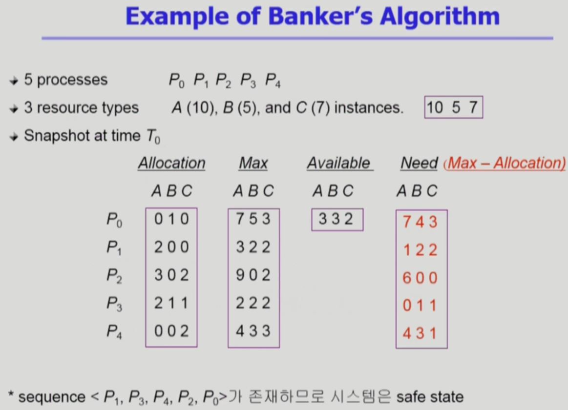 - 그래서 프로세스에 순번(safe sequence)이 정해짐, 가용 자원으로 완전히 끝낼수 있는 프로세스부터 자원을 줘 먼저 끝내면 자원을 반환받아 더 큰 가용자원으로 더 자원을 많이 요구하는 프로세스를 끝냄