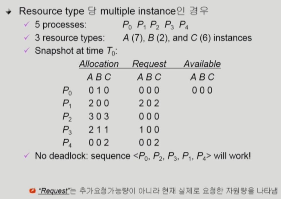 - 자원의 instance가 하나밖에 없을때와 자원이 여러개일때 사용하는 알고리즘이 다름