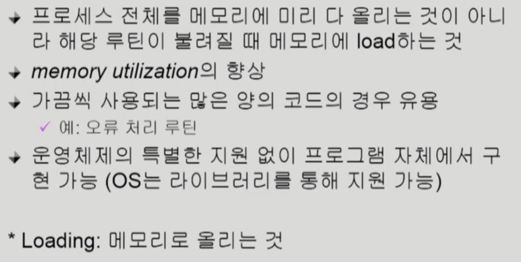 - 프로세스가 시작하기 전 전체를 메모리에 미리 올리는 것이 아닌 불려질때마다 메모리에 load 시키는것