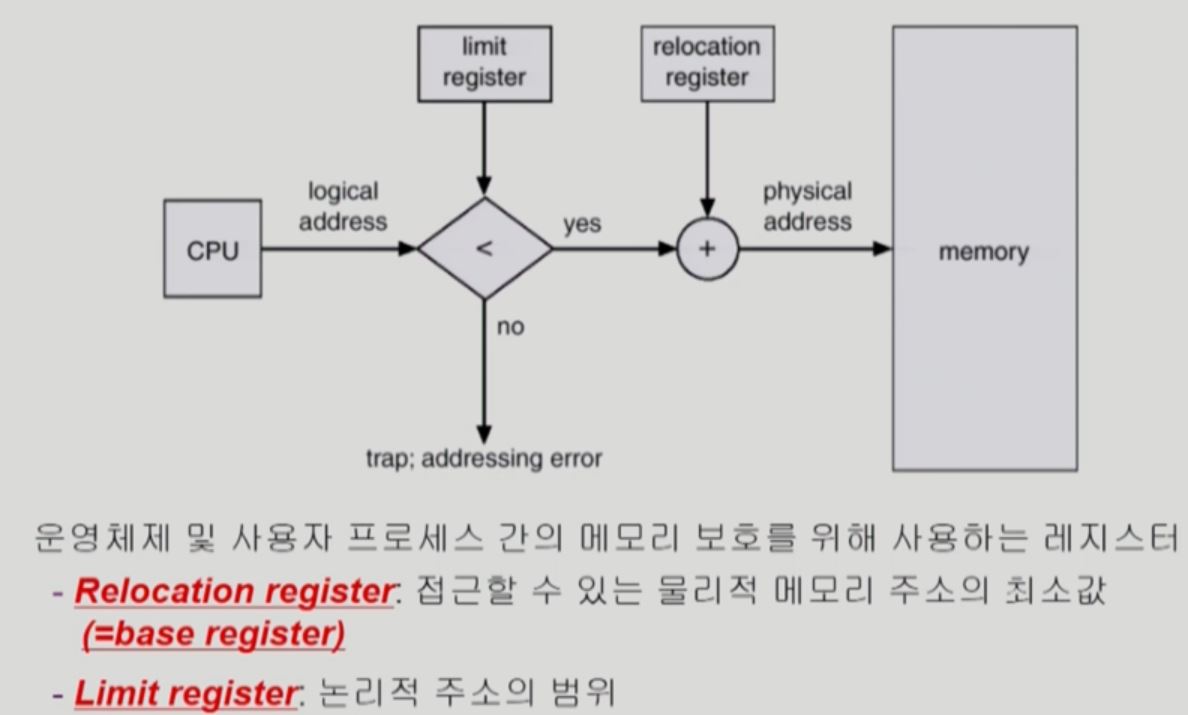 - 안넘으면 relocation register가 논리적 주소를 물리적 주소로 변환시켜줘서 실제 메모리에 접근할수 있도록 함