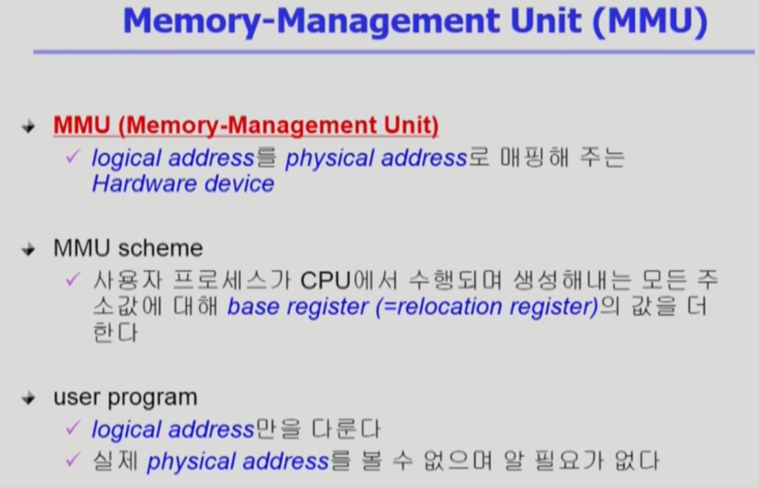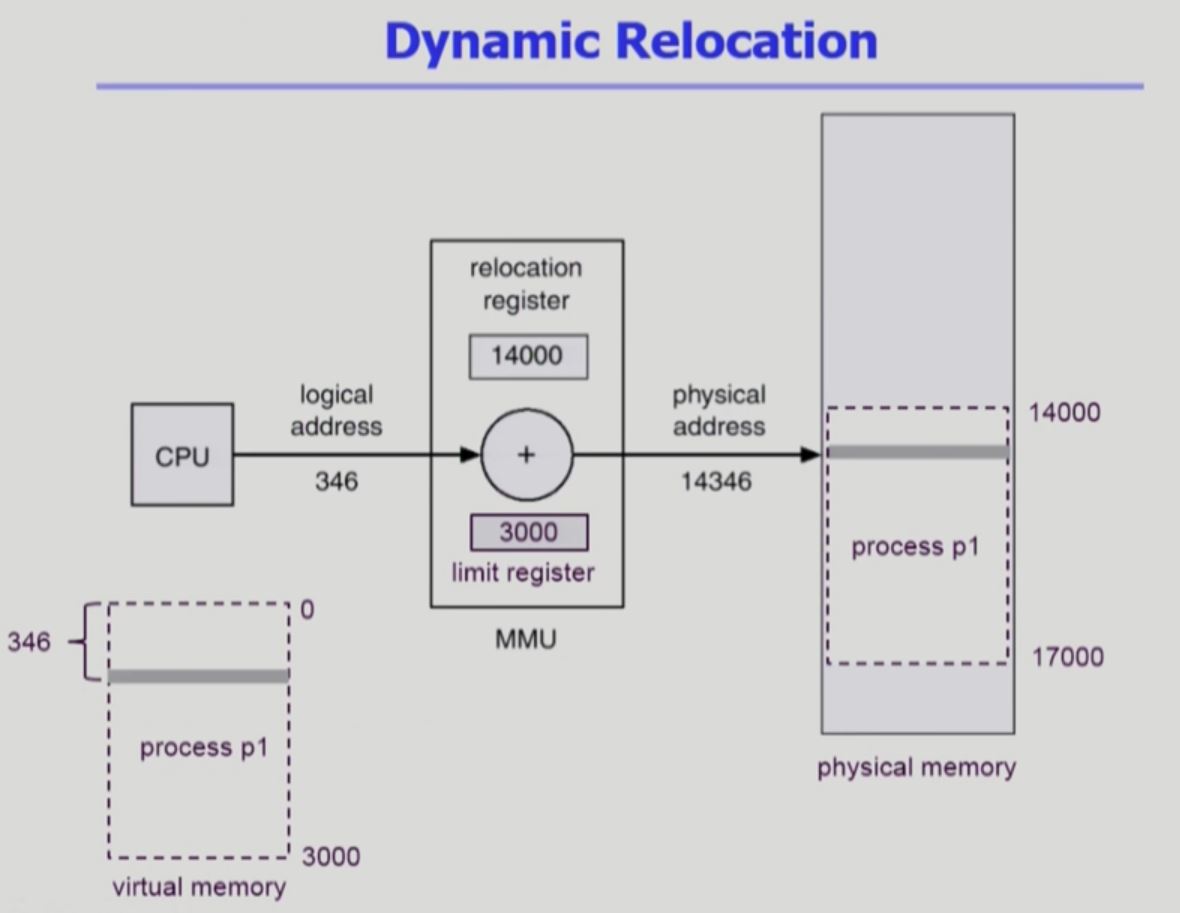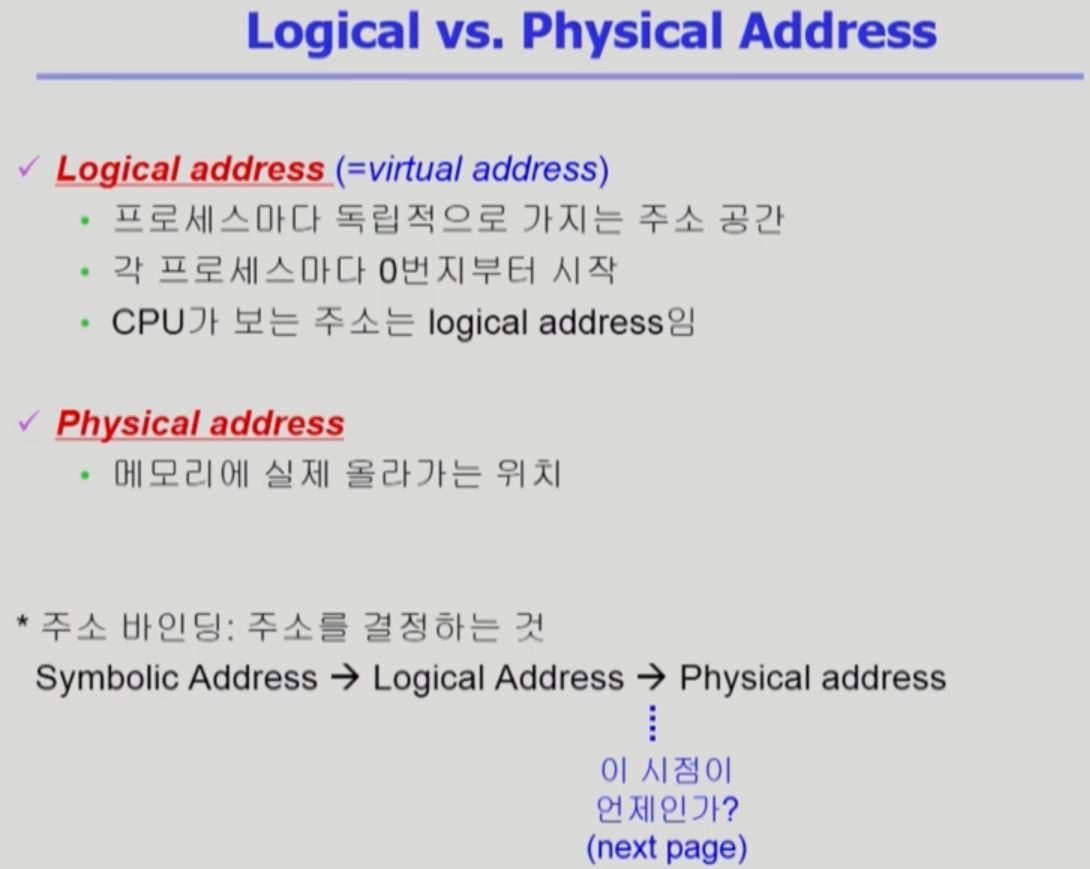 - 논리적주소만 가지고 있다가 프로그램이 시작되면 그때 물리적 주소에 올라감, 프로그램 시작중에 주소가 바뀌진 않지만 논리적 주소와 물리적 주소의 번지수가 다를 수 있음