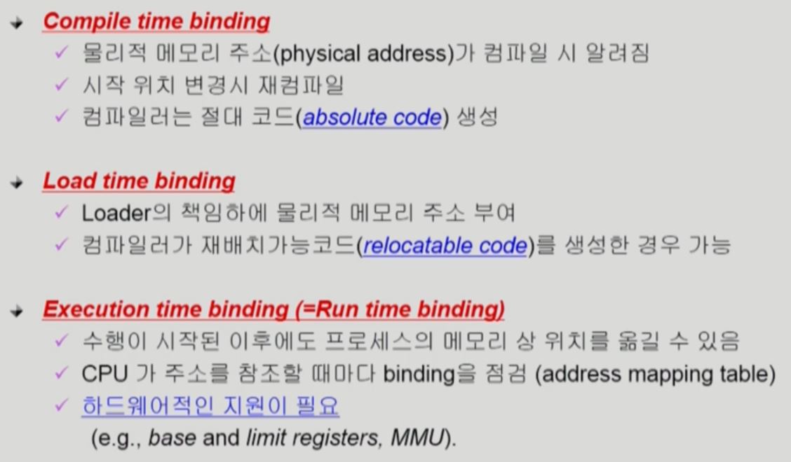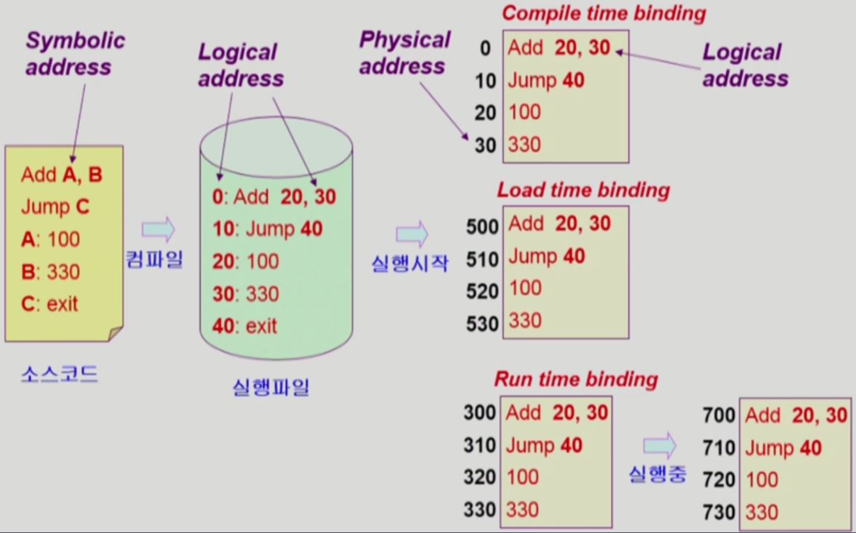 - 주소 바인딩: 논리적 주소를 실제 어느 물리적주소에 올릴지 정함